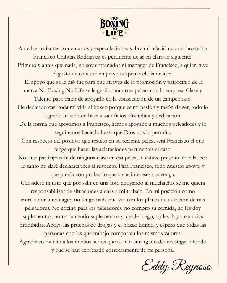 "Considero injusto que por salir en una foto apoyando al muchacho, se me quiera responsabilizar de situaciones ajenas a mi trabajo", expresó Reynoso en su comunicado. Asimismo, reiteró que su único vínculo con Rodríguez fue comercial, relacionado con su marca "No Boxing No Life" y su promotora "Clase y Talento", con la cual apoyó al boxeador en tres combates.
