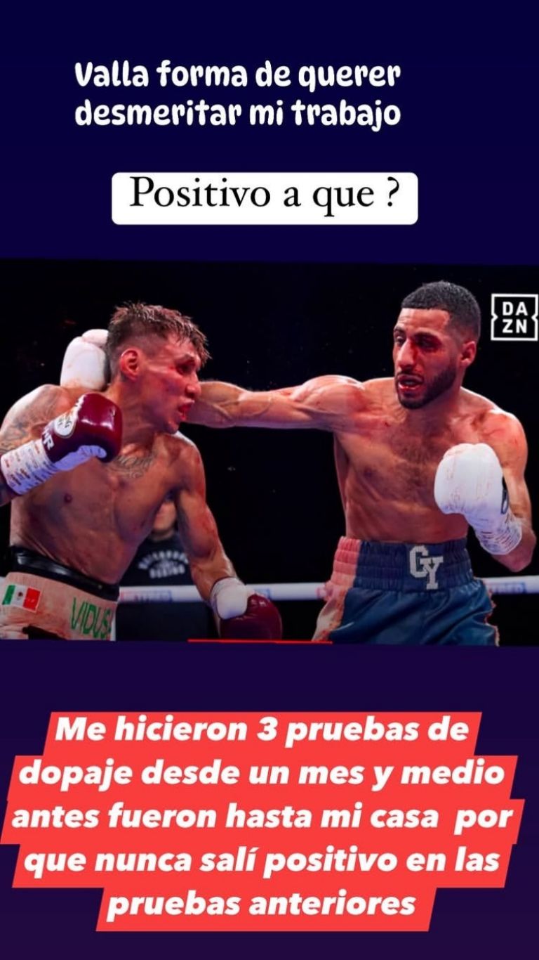 "Vaya forma de querer demeritar mi trabajo. ¿Positivo a qué? Me hicieron 3 pruebas de dopaje desde un mes y medio antes; fueron hasta mi casa. ¿Por qué nunca salí positivo en las pruebas antidoping?", cuestionó el boxeador en su cuenta de Instagram, misma que horas después luce deshabilitada.