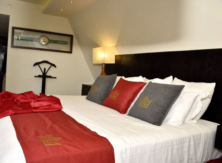 La cama tenía cojines con el logotipo que identifica al histórico deportista, mientras que los fans podían usar una bata en color rojo y pantuflas que también tenían el sello del campeón mundial.