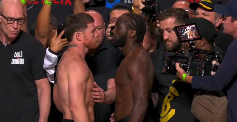 Una vez que bajó de la báscula, el tapatío no perdió tiempo y fue directamente a buscar a Crawford para el último cara a cara previo a la pelea, en el cual se cruzaron las miradas, lanzando un reto claro y "sacando chispas". Ambos fueron muy respetuosos, sin caer provocaciones.