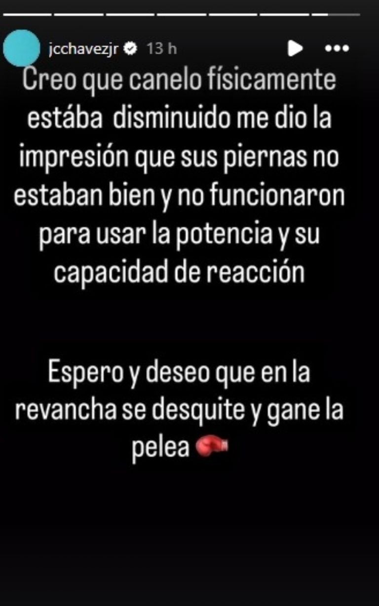 Tras la pelea, Julio César Chávez Jr. compartió su visión del desempeño de su compatriota a través de redes sociales. El hijo de la leyenda mexicana aseguró: "Creo que Canelo físicamente estaba disminuido, me dio la impresión que sus piernas no estaban bien y no funcionaron para usar la potencia y su capacidad de reacción".