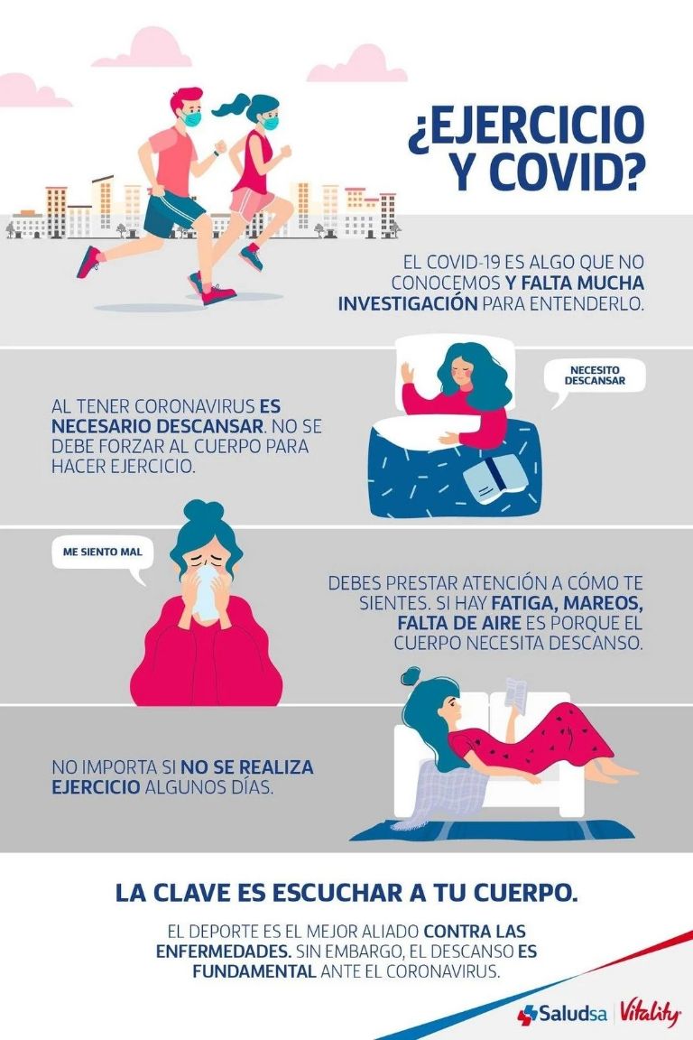 Al tener coronavirus -agregan- es necesario descansar y no forzar el cuerpo a hacer ejercicio, ya que realizar actividad física durante el contagio puede afectar la salud.