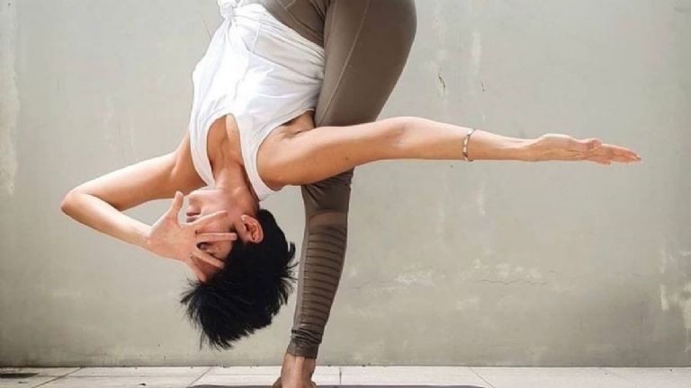 El triángulo sirve para estirar la cadera, los isquiotibiales, las pantorrillas los hombros, la columna y el pecho, también fortalece las rodillas, los tobillos y los cuádriceps. Ponte de pie sobre tu tapete, levanta los brazos extendidos, mira tu pie izquierdo y baja estirando el mismo brazo izquierdo y el derecho estiralo como si quisieras tocar el techo.