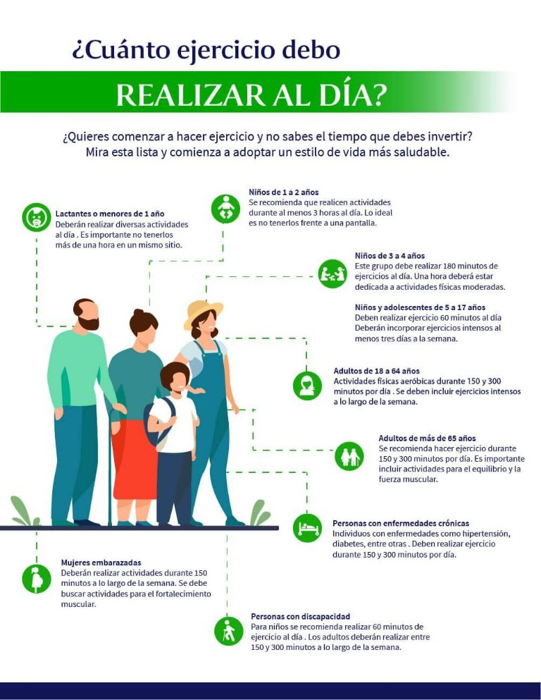 Para la Organización Mundial de la Salud el tiempo esencial que una persona de entre 18 y 65 años debe entrenar a la semana son al menos 150 a 300 minutos de actividades físicas aeróbicas moderadas o mínimo de 75 a 150 minutos de intensa, además la necesidad de realizar dos o más días a la semana ejercicios de fuerza moderados o más intensos que ejerciten todos los grupos musculares principales.