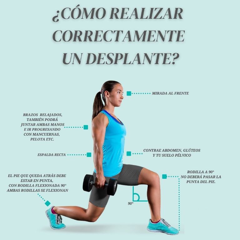 Los desplantes normales, derecho, con la espalda recta y mirando hacia el frente con los pies ligeramente separados a la altura de los hombros, te ayudarán a activar el abdomen y mantener tu postura erguida, aunque debes hacerlo sumiendo el ombligo, dando un paso largo al frente, bajando tu cadera hasta que tu rodilla contraria casi toque el piso y luego regresando a tu posición inicial, para luego hacer lo mismo con la otra pierna.