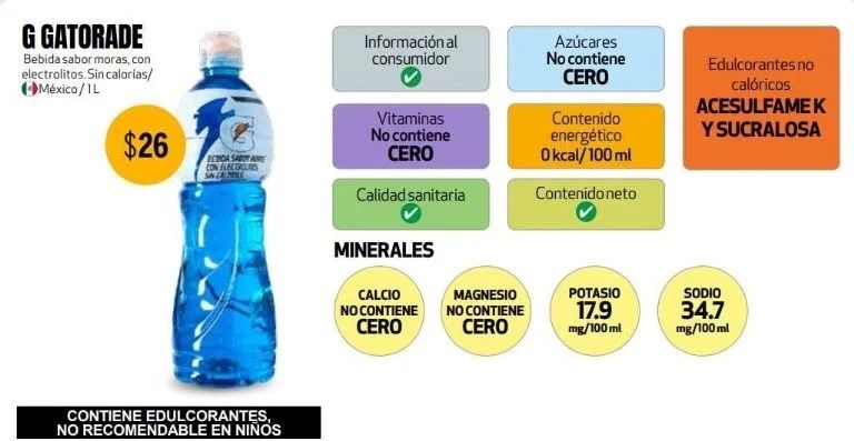 Por ello, la bebida que aporta mayores beneficios a tu cuerpo, además del agua y según el estudio de la Profeco, son: G Gatorade sabor moras con electrolitos, que no tiene calorías, calcio ni magnesio, así como la G Active de Gatorade sabor mandarina, con electrolitos y fortificada con vitaminas, sin calorías ni calcio ni magnesio. Ah, pero cuidado: ninguno de los dos es recomendable en niños, pues no contiene edulcorantes.