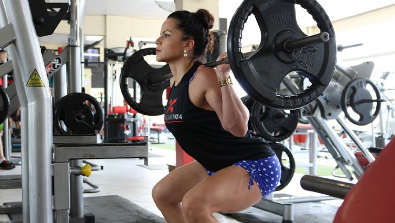 - El segundo es la sentadilla libre, aquí puedes ir subiendo de nivel conforme realizas tus series, por ejemplo, puedes iniciar con un peso de 10 kilógramos por lado y hacer 15 repeticiones, en la segunda serie 15 kilos y 12 repeticiones, en la tercera 20 kilos y 12 repeticiones, para que en la cuarta, metas 25 kilos y saques por lo menos de 8-10 repeticiones.