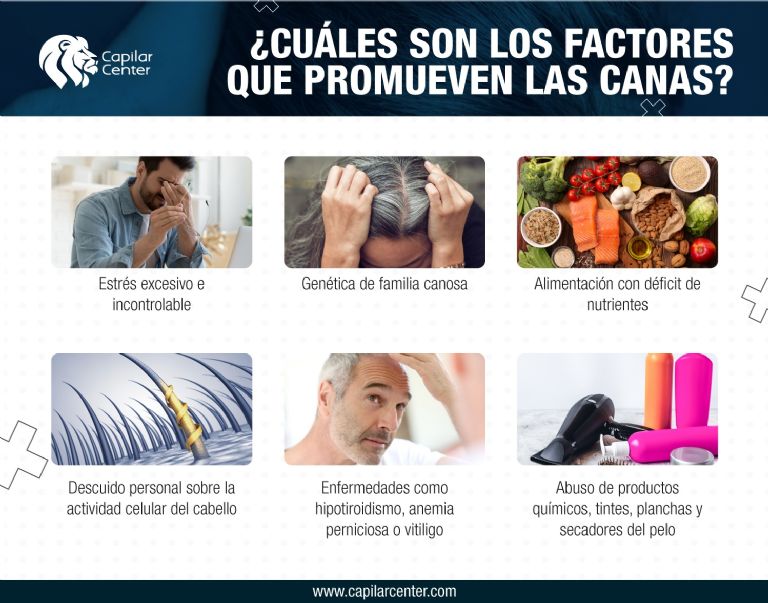 Ah, pero eso no es todo, pues otras causas que promueven el desarrollo de canas y que puedes combatir con este tratamiento de belleza son el estrés crónico como consecuencia de los cambios metabólicos que conlleva, la falta de nutrientes y vitaminas como el hierro, zinc, sílice, cobre y vitaminas del grupo B, enfermedades como hipotiroidismo o anemia perniciosa que provocan déficit de vitamina B12, como efecto secundario de medicamentos y por el maltrato prolongado del cabello, ya sea por falta de higiene, abuso de secadores o planchas de pelo y lavados con agua excesivamente caliente, etcétera.