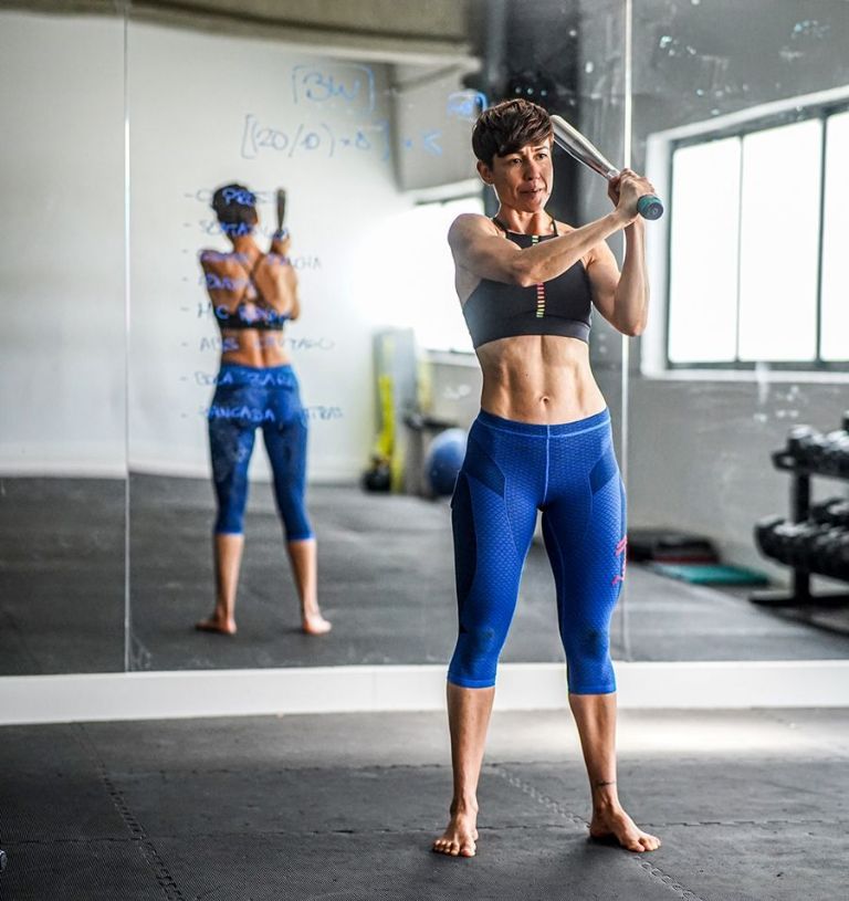 Pasa el clubbell, bate o mancuerna o los brazos por detrás de la espalda y la cabeza, intentando mantener el equilibrio en todo momento para que no se vaya hacia atrás ni arquear el lumbar. Es clave tener el abdomen muy fuerte durante todo el movimiento, además de controlar en todo momento los brazos y la espalda en este ejercicio de fuerza muy sencillo, pero muy completo... ¡Inténtalo!