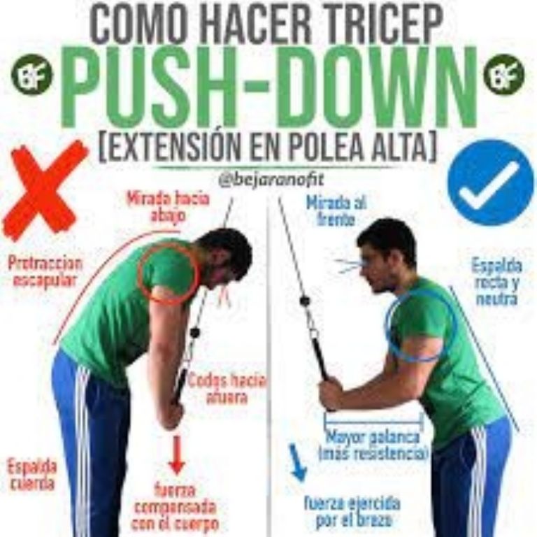 Si bien los tricep pushdown son muy efectivos, es indispensable realizarlos correctamente para evitar lesiones y aprovecharlas al máximo para eliminar las alas de murciélago, procurando no permitir que tus codos se abran hacia afuera al empujar hacia abajo y asegurándote de empujar hacia abajo de manera suave y uniforme con ambos brazos.