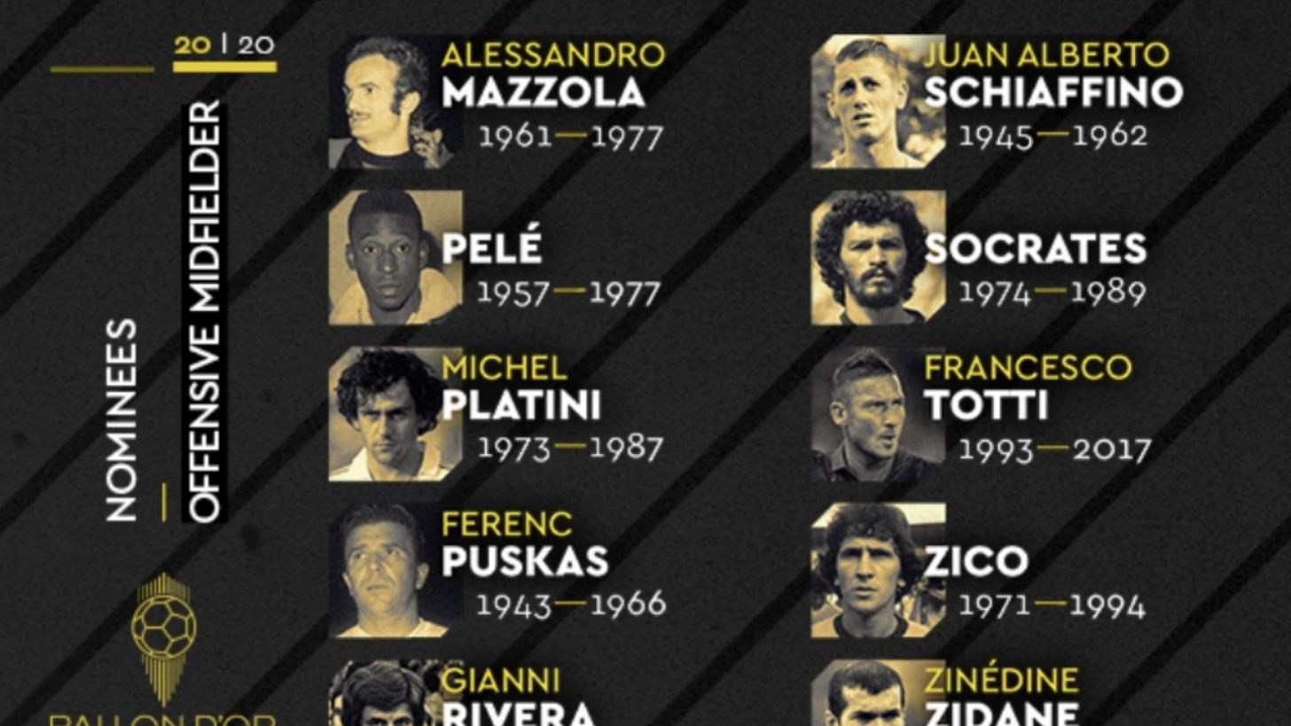 La revista francesa France Football anunció el nombre de los nominados a mejor mediocampista defensivo y ofensivo en la historia del futbol, en el premio Balón de Oro Dream Team, un galardón que este año sustituye al Balón de Oro tradicional, postergado a causa del Covid-19.