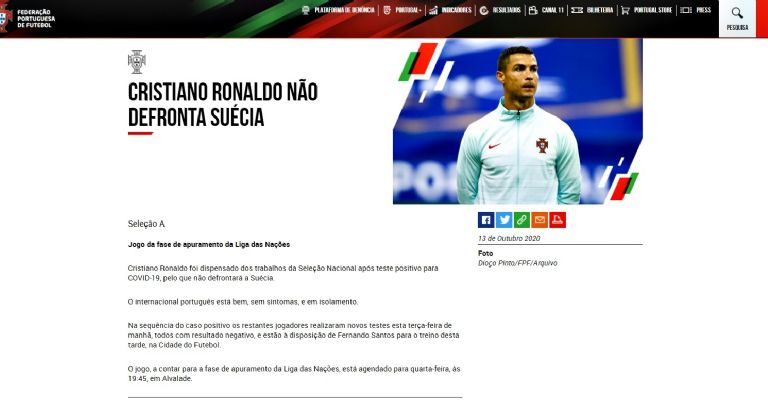 En tanto, la Federación Portuguesa también confirmó que el partido ante el seleccionado sueco se jugará este miércoles 14 de octubre tal como estaba programado, aún con el caso positivo de Cristiano Ronaldo.