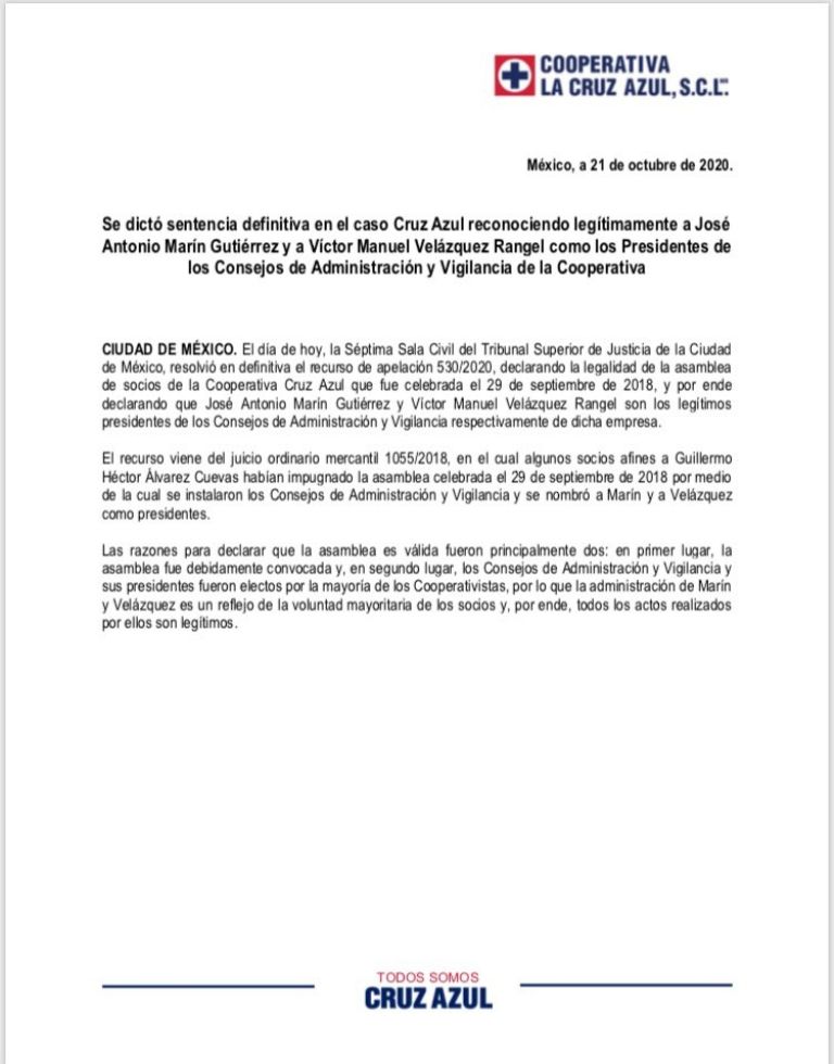 El día de hoy, la Séptima Sala Civil del Tribunal Superior de Justicia de la Ciudad de México, resolvió en definitiva el recurso de apelación 530/2020, declarando la legalidad de la asamblea de socios de la Cooperativa Cruz Azul que fue celebrada el 29 de septiembre de 2018, y que por ende declarando que José Antonio Marín y Víctor Manuel Velázquez Rangel son los legítimos presidentes de los Consejos de Administración y Vigilancia respectivamente de dicha empresa. Se lee en el comunicado.