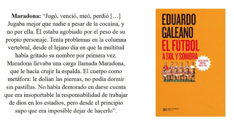 “Cuando Maradona fue, por fin, expulsado de ese Mundial, las canchas de futbol perdieron a su rebelde más clamoroso. Y también perdieron a un jugador fantástico. Maradona es incontrolable cuando habla, pero mucho más cuando juega: no hay quien pueda prever las diabluras de este inventor de sorpresas, que jamás se repite y que termina desconcertando a las computadoras”, cuenta Galeano en su libro ‘El futbol a sol y sombra’.