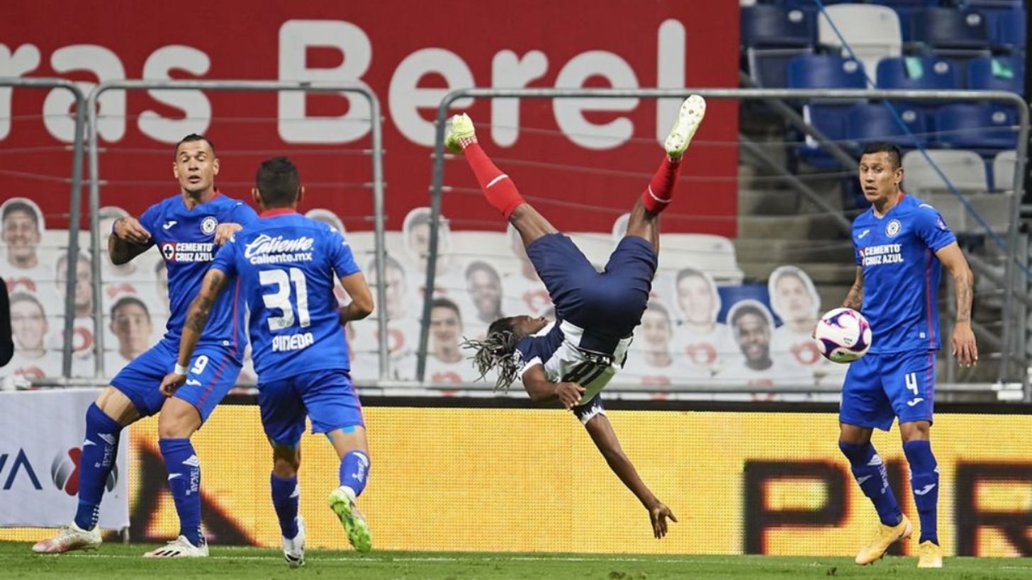 El delantero del Monterrey, Avilés Hurtado por poco se lastima seriamente al intentar una chilena en el encuentro entre Rayados y Cruz Azul.