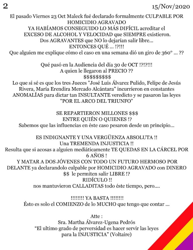 Luego de darse a conocer la sentencia de 3 años y 8 meses, con la posibilidad de cumplir su condena en libertad condicional al exfutbolista Joao Maleck por el asesinato culposo de María Fernanda Peña y Alejandro Castro en un accidente automovilístico.