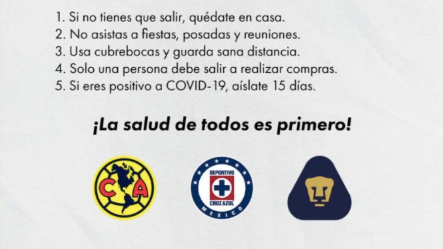 “Sabemos que estas fechas son de convivencia, pero es muy importante la colaboración de todos en este momento. Por eso, Club América, Cruz Azul y Pumas te pedimos seguir las indicaciones de las autoridades de salud”, refirió el documento.