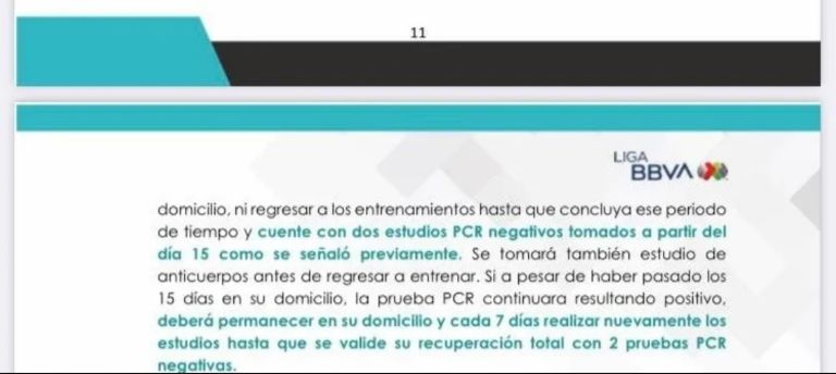 "El jugador no podrá regresar a los entrenamientos hasta que concluya ese periodo de tiempo y cuente con dos estudios PCR negativos tomados a partir del día 15 como se señaló previamente. Se tomará también estudio de anticuerpos antes de regresar a entrenar. Si a pesar de haber pasado los 15 días en su domicilio, la prueba PCR continuara resultando positivo deberá permanecer en su domicilio y cada 7 días realizar nuevamente los estudios hasta que se valide su recuperación total con 2 pruebas PCR negativas".