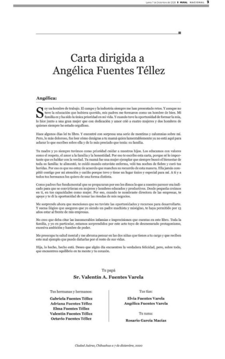 La misiva fue firmada por los cinco hermanos de Angélica (Gabriela, Adriana, Elma, Valentín y Octavio), dos de sus tías paternas (Elvia y Angélica Fuentes Varela) y su nana (Rosario García Macías), y circuló en redes sociales contraponiendo la versión del libro autobiográfico de la empresaria.