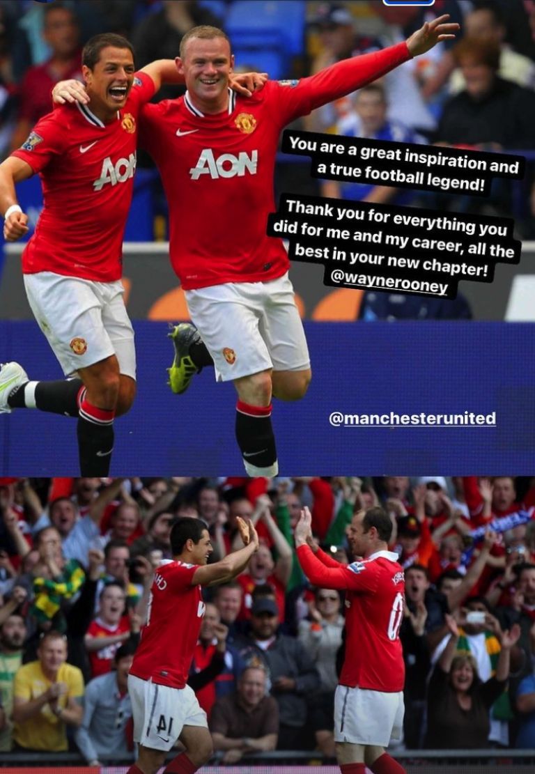 A través de su cuenta oficial de Instagram, Chicharito, quien compartió vestuario con Rooney en el Manchester United entre 2010 y 2014, compartió una Historia con dos fotografías al lado del inglés y palabras de agradecimiento por cómo lo ayudo durante su periodo en Old Trafford.