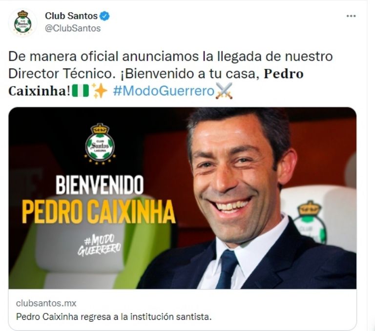 El Club Santos Laguna hizo oficial el regreso de Pedro Caixinha como su nuevo técnico, después de la salida de Guillermo Almada, quien no pudo meter a los Guerreros a las semifinales del Torneo Apertura 2021 de la Liga MX, tras empatar en el global contra Tigres, siendo el club felino el que avanzó por mejor posición en la tabla.