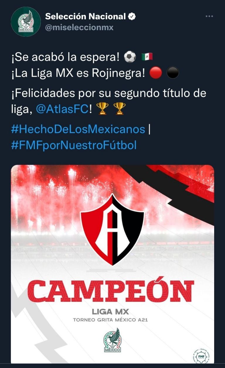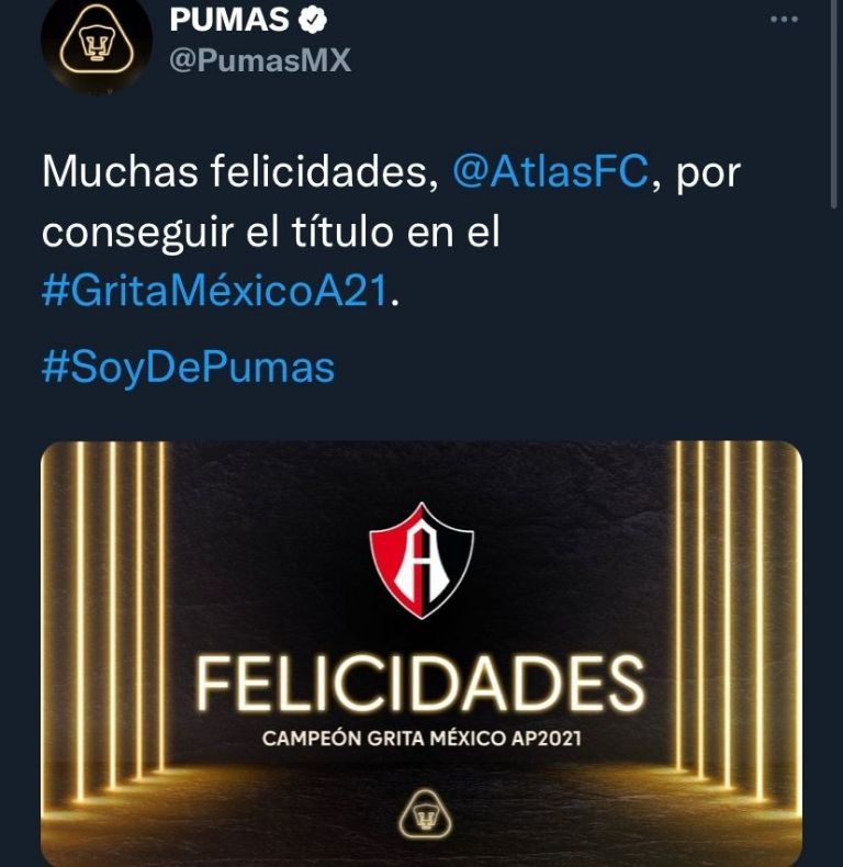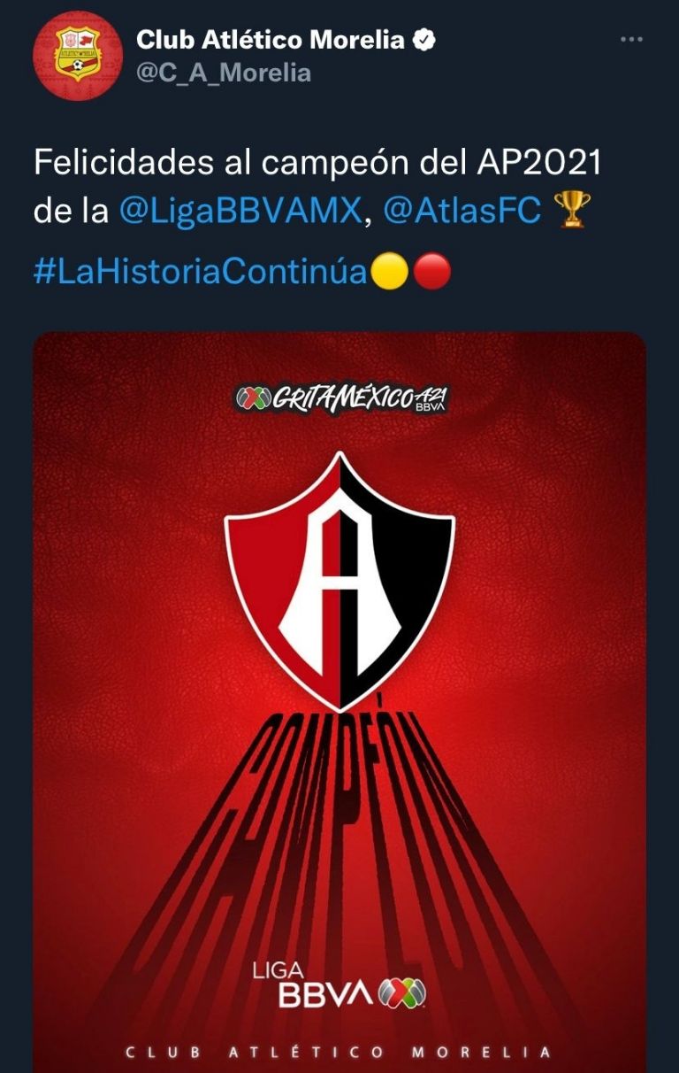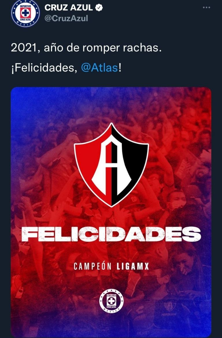Todos los clubes del futbol mexicano de la Liga MX felicitaron al Atlas quien es campeón del Apertura 2021 a través de sus cuentas oficiales de Twitter, las Chivas pusieron sólo una imagen con el triunfo, muy forzado.