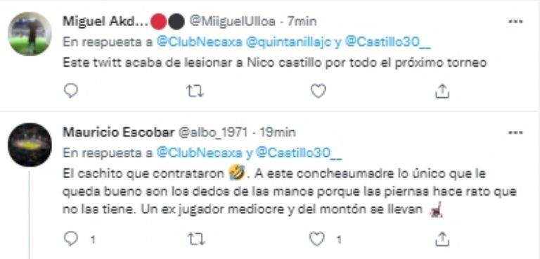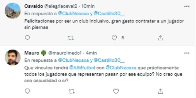 A poco más de una hora desde que se publicó el informe en Twitter, Necaxa ha recibido cerca de cien comentarios en el mismo. Algunos de estos le auguran muchos éxitos al chileno; sin embargo, es una realidad que la mayoría criticó el fichaje asegurando que la institución no puede ofrecerles futbolistas "de su nivel".