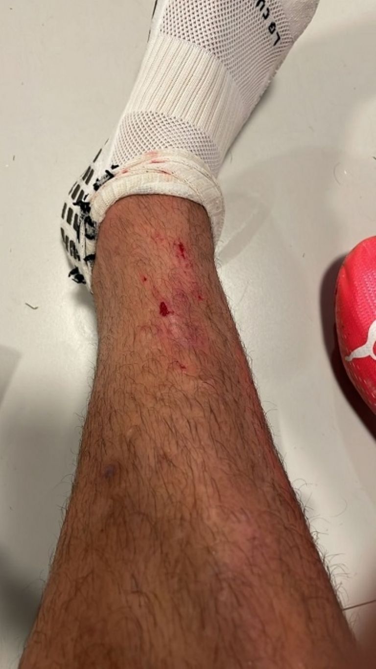Fue la esposa del futbolista, Sofi Bruno, la que publicó la fotografía de la pierna de Juan Ignacio, en la que se aprecian marcas de tachones a la altura de la espinilla con algo de sangre, más tarde Alonso Cabral mostró otra imagen.