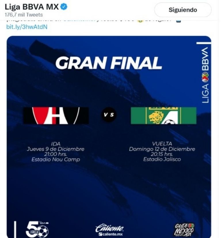La Liga MX confirmó las fechas y horarios en que se disputará la gran final entre Atlas y León. Tal como lo estipula el reglamento será este jueves cuando se dispute la ida en el Nou Camp y el próximo domingo 12 de diciembre la vuelta en el Estadio Jalisco para definir al campeón.