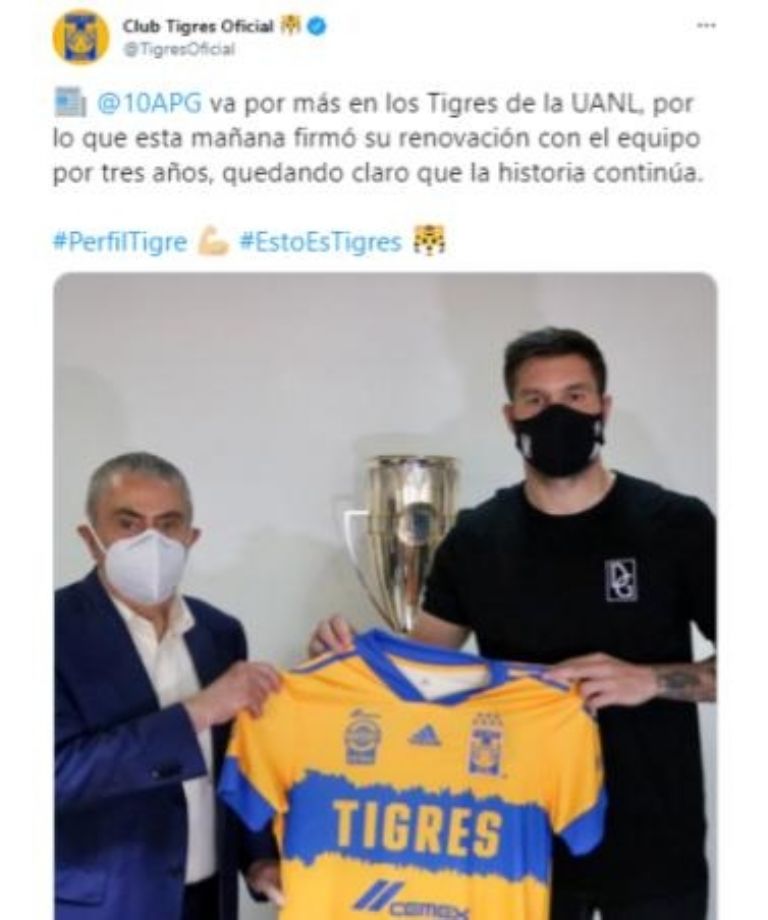 André-Pierre Gignac va por más en los Tigres de la UANL, por lo que esta mañana firmó su renovación con el equipo por tres años, quedando claro que la historia continúa", escribió el club en su cuenta oficial.