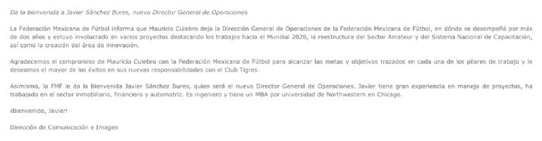 A través de un comunicado, la FMF agradeció la labor de Culebro, ex directivo del América, "para alcanzar las metas y objetivos trazados" por el organismo y le deseó éxitos en sus nuevas responsabilidades como parte de la plana mayor de los Tigres de la UANL.