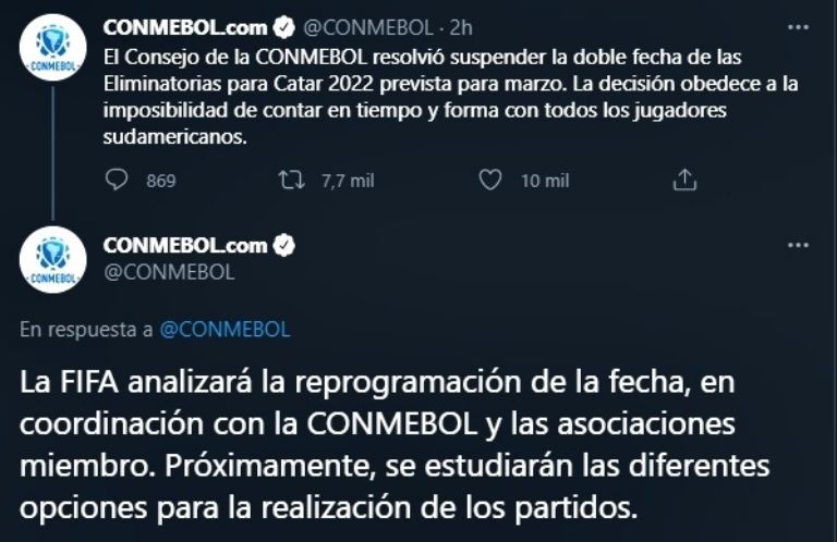 "El Consejo de la Conmebol resolvió suspender la doble fecha de las Eliminatorias para Qatar 2022 prevista para marzo. La decisión obedece a la imposibilidad de contar en tiempo y forma con todos los jugadores sudamericanos", informó el organismo sudamericano en un comunicado a través de sus redes sociales oficiales.