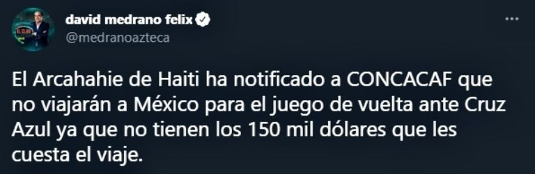Según informó David Medrano, periodista de TV Azteca y diario Récord, el Arcahaie FC notificó a Concacaf que "no viajarán a México" para el juego ante Cruz Azul del próximo martes 13 de abril.