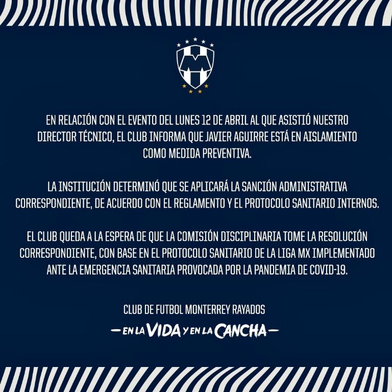 Monterrey publicó un video en sus redes sociales donde Javier Aguirre aparece para dar sus explicaciones sobre la polémica que se generó a su alrededor, donde asume las consecuencias de sus actos, aunque se haya justificado al decir que está vacunado contra el coronavirus y eso lo llevó a estar en la boda de su hijo.