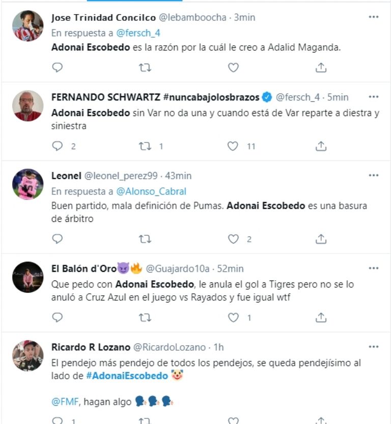 Sin embargo, eso no fue todo, pues usuarios en redes sociales, aficionados de Tigres y Pumas se le fueron con todo sobre la actuación de Adonai Escobedo en Ciudad Universitaria.