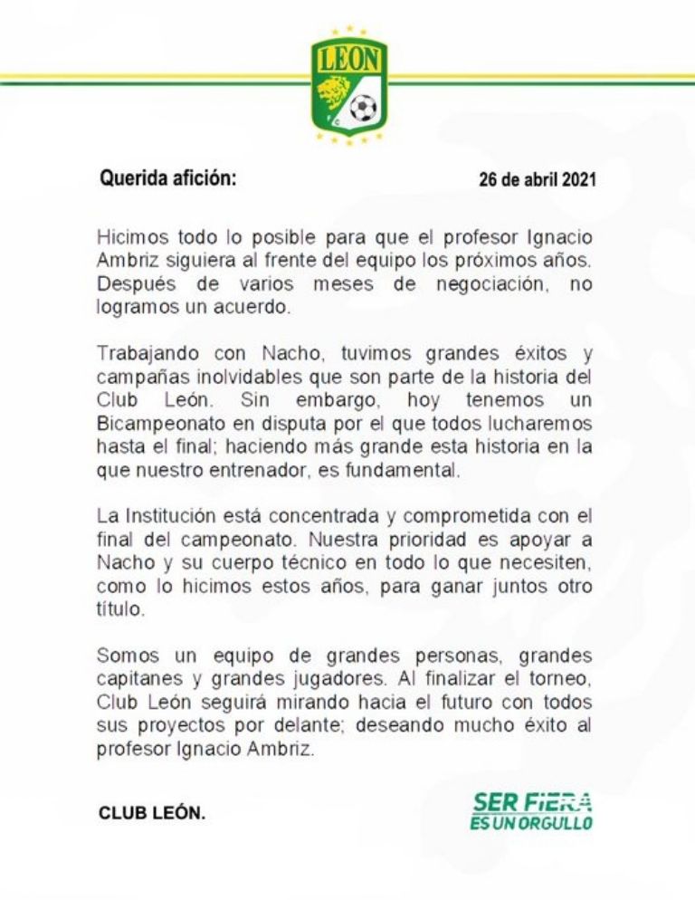 “Trabajando con Nacho tuvimos grandes éxitos y campañas inolvidables que son parte de la historia del Club León. Sin embargo, hoy tenemos un Bicampeonato en disputa por el que lucharemos hasta el final; haciendo más grande nuestra historia, en la que el entrenador es fundamental”, se lee en el comunicado.