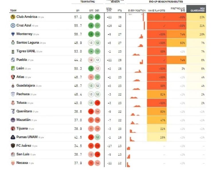 El sitio especializado FiveThirtyEight arrojó los resultados de la última fecha, pero además puso a los equipos que tienen más probabilidades de ser campeón, donde aparentemente Cruz Azul volverá a quedarse con las ganas y será el América quien levante el título del Guardianes 2021.