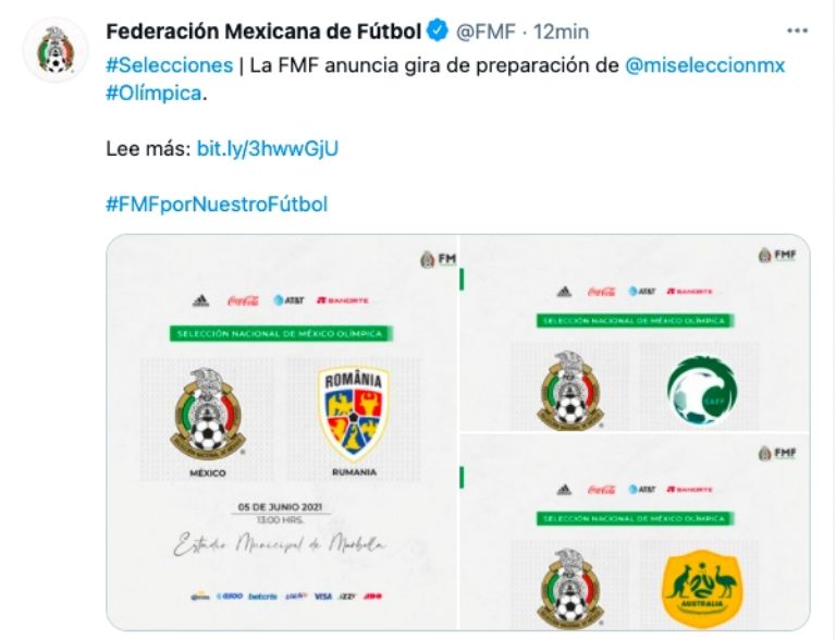 La Federación Mexicana de Futbol (FMF) anunció este jueves que la Selección Mexicana, campeona del torneo Preolímpico de Concacaf, realizará una gira de preparación por Marbella, España, donde se medirá a Rumanía, Arabia Saudí y Australia, representativos calificados también a los Juegos Olímpicos de Tokio 2020.