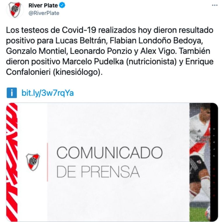 La lista de nuevos contagios incluye a Leonardo Ponzio, Gonzalo Montiel y Lucas Beltrán, quienes integraron el equipo que enfrentó a Boca el domingo por la Copa de la Liga argentina, además de Alex Vigo y el juvenil colombiano Flabián Londoño Bedoya, informó el club en un comunicado.