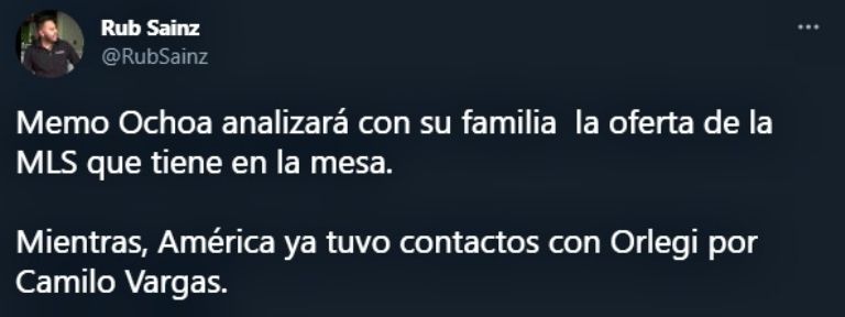 Guillermo Ochoa podría ser uno de esos futbolistas que dejarían América. Según informó el periodista de TUDN, Rub Sainz, 'Paco Memo' tiene una oferta importante de la Major League Soccer (MLS) para continuar su carrera. Al parecer, estaría analizando ese ofrecimiento junto a su familia, pese a que tiene contrato asegurado hasta diciembre de 2022 con las 'Águilas'.