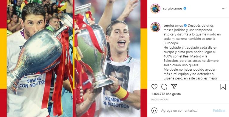 Tras conocer la decisión de Luis Enrique a la selección para la Euro 2020, Sergio Ramos publicó en sus redes sociales un emotivo mensaje, acompañado de una fotografía con las dos copas de Europa que ganó con la Roja.