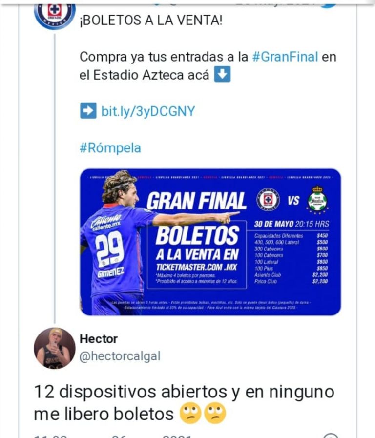 La venta de boletos para la final de vuelta entre Cruz Azul y Santos fue anunciada para este miércoles en punto de las 11:00 horas a través del sitio web de Ticketmaster; sin embargo, los aficionados que se dieron cita para adquirir sus entradas nunca pudieron acceder a los mismos