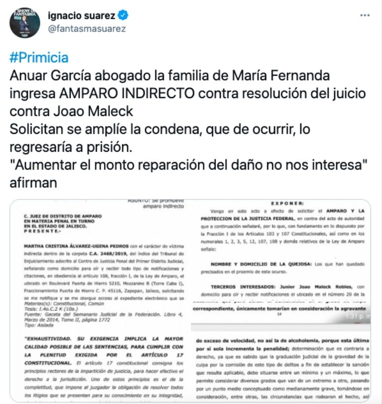 Anuar García abogado la familia de María Fernanda, ingresó un amparo indirecto contra la resolución del juicio de Maleck y solicitó que se amplíe la condena, para regresarlo a prisión. "Aumentar el monto reparación del daño no nos interesa", afirmaron los familiares.