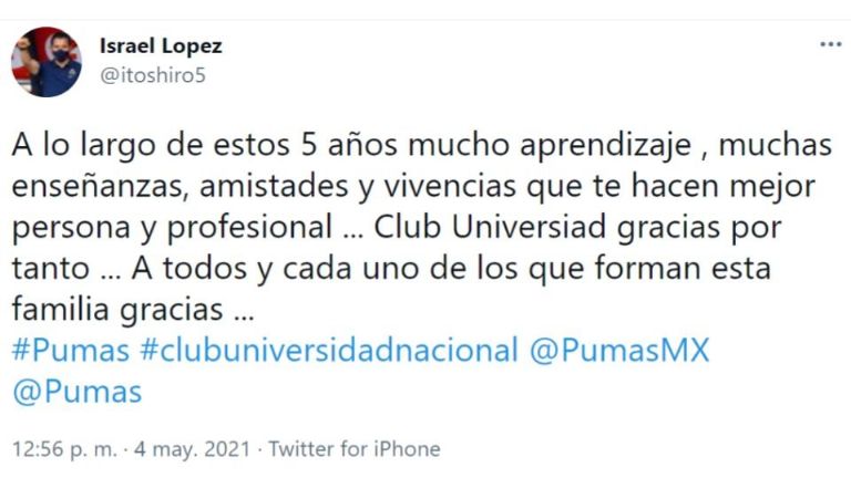 Se trata de un elemento que forma parte del cuerpo técnico de Lillini. Será Israel López, ahora exauxiliar del argentino, el que anunció el final de su ciclo en el equipo del Pedregal.