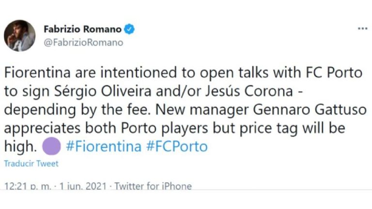 La Fiorentina tiene la intención de conversar con el FC Porto para fichar a Sérgio Oliveira y/o Jesús Corona, dependiendo de la tarifa. El nuevo entrenador Gennaro Gattuso desea a los dos jugadores del Porto, pero el precio será alto”,publicó el periodista en Twitter.