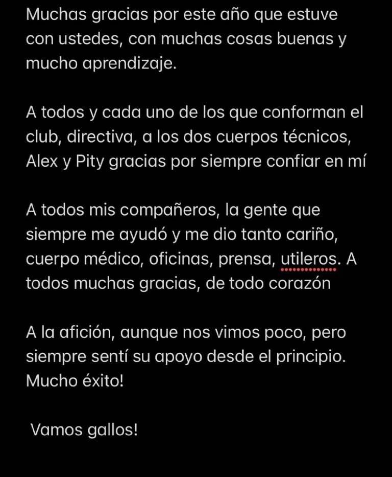 Después, con un mensaje de despedida a quien fuera uno de los jugadores más regulares en el pasado año futbolístico para el equipo que dirige Héctor Altamirano, con bajo presupuesto, y con jugadores que buscaban mostrarse en Primera para encontrar cabida en el equipo.