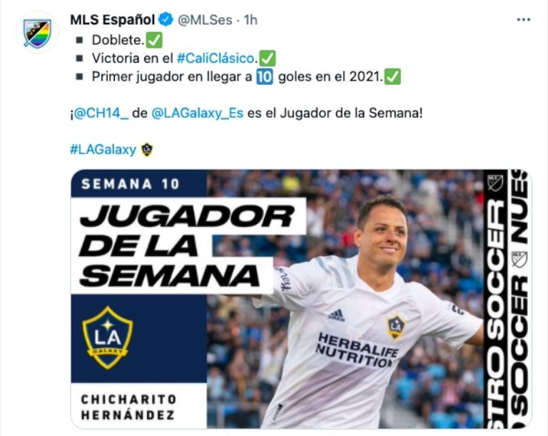 El delantero mexicano Javier 'Chicharito' Hernández, de Los Angeles Galaxy, fue elegido este lunes como el Jugador de la Semana en la Major League Soccer (MLS).