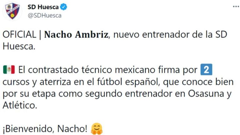 𝐍𝐚𝐜𝐡𝐨 𝐀𝐦𝐛𝐫𝐢𝐳, nuevo entrenador de la SD Huesca. El contrastado técnico mexicano firma por cursos y aterriza en el fútbol español, que conoce bien por su etapa como segundo entrenador en Osasuna y Atlético. ¡Bienvenido, Nacho!", escribió el Huesca en sus redes sociales.