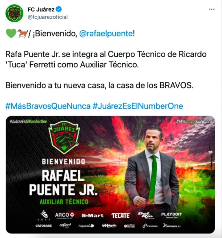 "Rafa Puente Jr. se integra al Cuerpo Técnico de Ricardo 'Tuca' Ferretti como Auxiliar Técnico. Bienvenido a tu nueva casa, la casa de los Bravos", escribió el club.
