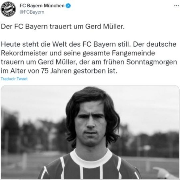 El FC Bayern está de luto por Gerd Müller. Hoy el mundo del FC Bayern se detiene. Los campeones de récords alemanes y toda su base de fanáticos lloran a Gerd Müller, quien murió temprano el domingo por la mañana a la edad de 75 años", se lee en la cuenta de Twitter del equipo.